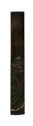 | Keywords: Iwamoto Konkan - Kozuka with Daruma - Walters 51739.jpg Daruma Sk Bodhidharma was an Indian Buddhist who lived in the 6th century He is recognized as the founder of Zen Buddhism Legends claim that he traveled to China and Japan Here he is shown standing on a reed which he used to cross the ocean from China to Japan The artist's signature and seal are on the reverse between 1744 1801 Edo shibuichi gold cm 9 5 l accession number 51 739 39885 Henry Walters Baltimore date and mode of acquisition unknown Walters Art Museum Henry Walters Acquired by Henry Walters signature place of origin Edo present-day Tokyo Japan Walters Art Museum license Kozuka in the Walters Art Museum Iwamoto Konkan Media contributed by the Walters Art Museum needs category review |