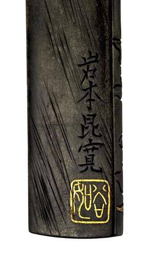 Keywords: Iwamoto Konkan - Kozuka with Daruma - Walters 51739 - Mark A.jpg Daruma Sk Bodhidharma was an Indian Buddhist who lived in the 6th century He is recognized as the founder of Zen Buddhism Legends claim that he traveled to China and Japan Here he is shown standing on a reed which he used to cross the ocean from China to Japan The artist's signature and seal are on the reverse between 1744 1801 Edo shibuichi gold cm 9 5 l accession number 51 739 39885 Henry Walters Baltimore date and mode of acquisition unknown Walters Art Museum Henry Walters Acquired by Henry Walters signature place of origin Edo present-day Tokyo Japan Walters Art Museum license Kozuka in the Walters Art Museum Iwamoto Konkan Media contributed by the Walters Art Museum needs category review |