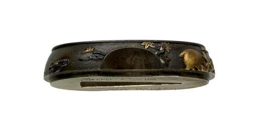 | Keywords: Iwazawa Ryôi - Fuchi with Deer and Maple Tree - Walters 5111832A.jpg A gold deer and a black deer are shown beneath branches of a maples tree with leaves in various metals Both maples and deer are associated with autumn This is part of a mounted set 1858 late Edo silver gold shakudo copper alloy cm 4 2 accession number 51 1183 2A 31067 William T / Henry Walters Collection Baltimore date and mode of acquisition unknown Walters Art Museum Henry Walters Acquired by William T or Henry Walters Date Ansei tsuchinoe uma tairyo; Translation Ansei era year of the horse 1858 12th month; Signature Iwazawa Ryoi kao place of origin Aizu Japan Walters Art Museum license Fuchi in the Walters Art Museum Iwazawa Ryôi Media contributed by the Walters Art Museum needs category review |