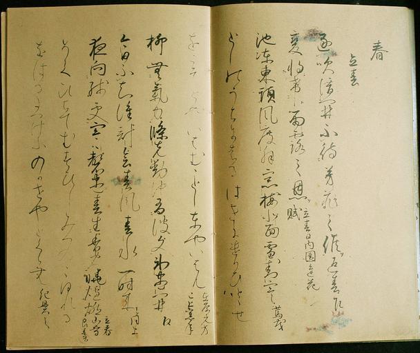 | Keywords: IYO GIRE Wakan roeishu2.JPG  en IYO GIRE Wakan rōeishū 2nd folio of uncomplete volume of Manuscript book ink on ornamented paper 25 6cm height 11th century ja 伊予切 和漢 詠集 春の部分 高さ25 6cm Replica before 1923 Anonymous 11th century century 11 Japanese calligraphy in the Heian period Wakan rōeishū PD-Art |