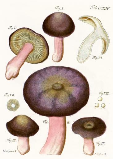 Keywords: J.C.Schaeffer- Fung. bavar. palat. nasc. Plate 214.png in Latin / German Translation ;Explanation of 214th copperplate engraving The 102nd agaric<br/> Fig I A still undeveloped fruiting body; with almost spherical cap <br/> Fig II A developed fruiting body; flat cap <br/> Figure III IV fruiting bodies of various developments and shapes <br/> Figure V Underside of a developed fruiting body <br/> Figure VII VIII The natural spore deposit and enlarged spores<br/> Image processed original copy at http //bibdigital rjb csic es/ing/Libro php Libro 1735 Pagina 34 LIBRARY Real Jardin Botánico CSIC 1770 Jacob Christian Schäffer 30 May 1718 - 5 January 1790 PD-old-100 Fungorum qui in Bavaria et Palatinatu circa Ratisbonam nascuntur Russula xerampelina |