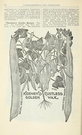 Keywords: J. Steckler Seed Co., Ltd. garden manual 1900 (16547002756).jpg 32 <br> J STECKLER SEED CO LTD ALMANAC AND <br> good supply for an unusually long season <br> This bean was brought out four years <br> ago Properly speaking it is not a Bush <br> Bean but a half climber; grows 6 to 8 feet <br> high; should have some bush to run up on <br> Otherwise the qualities are as described by <br> the introducer <br> Thorburn's Prolific Market This <br> Beau was introduced here from Ger- <br> many a few years ago The introducer <br> claims it to be an exceedingly vigorous and <br> healthy grower and enormously productive; <br> the pods being borne in clusters and as <br> many as 35 or 40 pods on each plant In <br> earliness it is with the Mohawk It is rust- <br> proof the seeds are black the pods are of <br> a light green color long and perfectly <br> round solid-fleshed and of very soft mar- <br> row For PRODUCTIVENESS SOLIDITY OF <br> FLESH AND ROUNDNESS OF POD it excels <br> any bean now in cultivation <br> ; fi-lf S <br> I 2 <br> Pi if 1 <br> Q <br> 3 z <br> H I iilm ' « <br> I i w <br> '/ /; N <br> 7 <br> EENEVbl USTLESS I <br> GOLDEN 1 WAX <br> tn <br> / 43933601 150250 78709 Page 32 Text http //www biodiversitylibrary org/page/43933601 1900 10 5962/bhl title 78709 Henry G Gilbert Nursery and Seed Trade Catalog Collection ; J Steckler Seed Co Biodiversity Heritage Library J Steckler Seed Co Ltd garden manual 1900 dealers in vegetable flower field and grass seeds Garden Stories Catalogs J Steckler Seed Co Seed industry and trade Seeds Trade catalogs Vegetables U S Department of Agriculture National Agricultural Library bhl page 43933601 dc identifier http //biodiversitylibrary org/page/43933601 bhlGardenStories Golden Wax Bean BHLinbloom j steckler seed co u s department of agriculture national agricultural library bhlgardenstories golden wax bean bhlinbloom Information field Flickr posted date ISOdate 2015-02-18 CC-BY-2 0 BioDivLibrary https //flickr com/photos/61021753 N02/16547002756 2015-08-24 02 51 18 cc-by-2 0 PD-old-70-1923 J Steckler Seed Co Ltd garden manual 1900 Photos uploaded from Flickr by Fæ using a script |