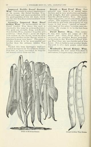| Keywords: J. Steckler Seed Co., Ltd. garden manual 1900 (16573012555).jpg 30 <br> J STECKXER SEED CO LTD ALMANAC AND <br> Improved Prolific Dwarf German <br> Wax This variety is a great improvement <br> on its parent the Dwarf German Wax <br> Pods are longer and more productive with <br> the good qualities of the old kind which <br> was the first Wax Bean introduced here from <br> Germany <br> Grenell's Improved Rust Proof <br> Golden Wax An improvement on the <br> Dwarf Golden Wax Bean; the seed is <br> identically the same in color as that kind <br> The pods are straight long and fleshier <br> than Golden Wax superior in quality and <br> positively Rust Proof - quite an object <br> with us here in the South when we often <br> have rainy weather in the Spring which is <br> injurious to most wax beans The origina- <br> tor also claims it to be more prolific and <br> hardier than the ordinary Golden Wax <br> Bean <br> We had this bean thoroughly tried and <br> found it so superior to the ordinary Golden <br> Wax that we have concluded to drop the <br> last named varit-tv from our list <br> Detroit or Rust Proof Wax This <br> splendid wax bean is of recent intro- <br> duction and is very productive and hard 7 ; <br> pods straight flat and somewhat broader <br> than the Dwarf Golden Wax The beans <br> when well grown are of a beautiful golden <br> yellow The originator claims that when <br> tried side by side with the majority of wax <br> beans it had never spotted or -rusted ' <br> while most of the other varieties were un- <br> salable He claims it to be the best bean <br> for shipping <br> Dwarf Butter Wax This variety <br> is also sold under the name of Bis- <br> marck ' and Rust Proof Wax It is <br> very early an excellent ltearer pods simi- <br> lar in shape to the Ward well's Dwarf Kid- <br> ney Wax; they are very brittle and of fine <br> flavor Not as liable to rust as other kinds <br> The seed is of a dark purple color when <br> dried <br> Wardwell's Dwarf Kidney Wax <br> Undoubtedly the best dwarf Wax Bean in <br> cultivation; it is quite early; the pods are of <br> Pride of Newton Beans <br> Dwarf Golden Wax Beans 43933603 150250 78709 Page 30 Text http //www biodiversitylibrary org/page/43933603 1900 10 5962/bhl title 78709 Henry G Gilbert Nursery and Seed Trade Catalog Collection ; J Steckler Seed Co Biodiversity Heritage Library J Steckler Seed Co Ltd garden manual 1900 dealers in vegetable flower field and grass seeds Garden Stories Catalogs J Steckler Seed Co Seed industry and trade Seeds Trade catalogs Vegetables U S Department of Agriculture National Agricultural Library bhl page 43933603 dc identifier http //biodiversitylibrary org/page/43933603 bhlGardenStories Pride of Newton Beans BHLinbloom j steckler seed co u s department of agriculture national agricultural library bhlgardenstories pride of newton beans bhlinbloom Information field Flickr posted date ISOdate 2015-02-18 CC-BY-2 0 BioDivLibrary https //flickr com/photos/61021753 N02/16573012555 2015-08-24 02 52 55 cc-by-2 0 PD-old-70-1923 J Steckler Seed Co Ltd garden manual 1900 Photos uploaded from Flickr by Fæ using a script |