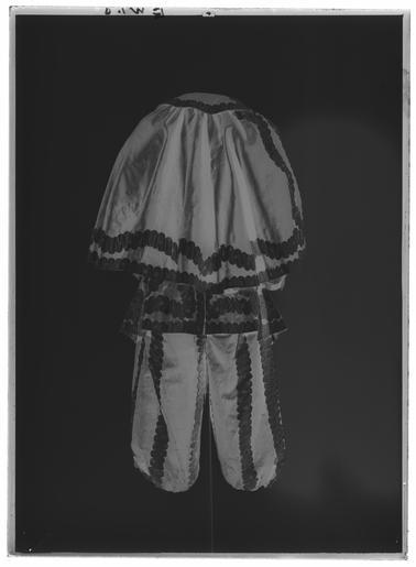 | Keywords: Jacka, "Bohemiens klädning" - Livrustkammaren - 44718-negative.tif LSH artwork sv Jacka av svart atlas formsydd i fyra stycken Knäppning fram med fyra knappar klädda i rosa siden på högra stycket diameter 15 mm Två sprund nedtill i sidorna längd 195 mm och ett mitt bak längd 185 mm Dekor i form av vågklippta veckade längsgående rosa sidenband med spridda silverpaljetter <br/>Korta vida ärmar som är veckade upptill <br/>Foder i benvitt linne tuskaft Kanterna fodrade i rosa siden <br/>Gåva tillsammans med gnr 17/46-17/192 av H M Konungen Gustav V genom chefen för Kungliga Husgerådskammaren original caption end other date century 18 silk Färg svart rosa d1 - dräkt - yttermaterial material sidenatlas - silk Färg rosa d2 - dräkt - foder material siden - silk Färg rosa d5 - dräkt - knappar och spännen material siden - sequins Färg silver d1 - dräkt - yttermaterial material paljetter - linen Färg benvit d2 - dräkt - foder material linne size mm 735 bak size mm 430 size mm 300 ärm g 507 LRK place of origin original filename LN_B16285_019165 57527 inventory number LRK 21500 44718 CC0 Jacka Bohemiens klädning - Livrustkammaren - 44718 tif <gallery caption Different images of same object > File Jacka Bohemiens klädning - Livrustkammaren - 61840 tif File Jacka Bohemiens klädning - Livrustkammaren - 70373 tif File Jacka Bohemiens klädning - Livrustkammaren - 53279 tif File Jacka Bohemiens klädning - Livrustkammaren - 36160 tif </gallery> |