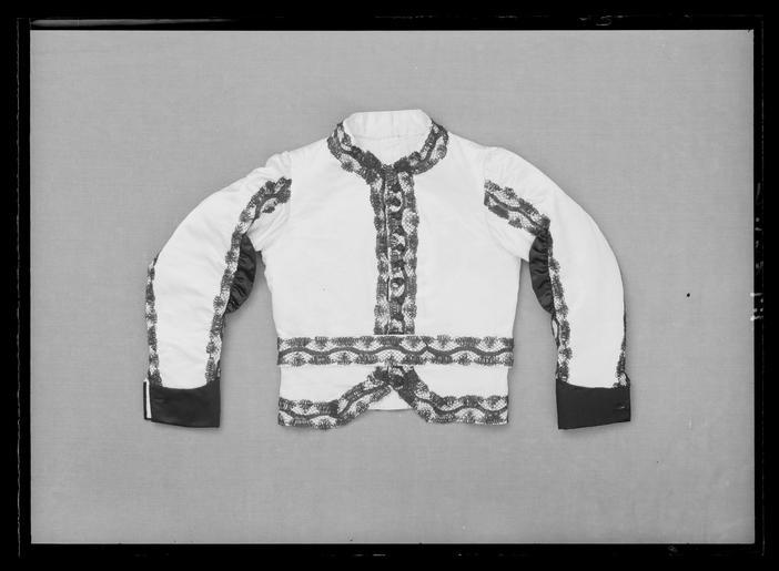 | Keywords: Jacka till Serafimerordensdräkt - Livrustkammaren - 35668.tif Midjekort jacka av vitt siden med isydd lång ärm och knäppning mitt fram i form av 13 svarta välvda räfflade knappar överspunna med svart silke Jackan kantad med 60 mm bred genombruten svart spets Ryggstycket skuret med figursömmar samt ryggsöm Denna och de övriga sömmarna belagda med svart spets Mittbak 70 mm långt sprund två likadana i de övriga sömmarna bak <br/><br/>Ärmsömmarna belagda med svart spets Nedtill slag av svart siden b 70 mm uppdraget i en spets mittfram Samt med sprund l 80 mm med ett knapphål I främre ärmsömmen mitt för armvecket ett halsfäriskt rynkat sidenstycke l 160 mm <br/><br/>Foder av gulvit bomull På vänster sida innerficka Utmed framkanterna mörkblått siden Hela jacka vadderad original caption decade 1840 silk Färg vit d1 - dräkt - yttermaterial material siden - silk Färg svart d5 - dräkt - knappar och spännen material silke - lace Färg svart d4 - Dräkt - passpoaler band kantning uppslag material spets - cotton Färg gulvit d2 - dräkt - foder material bomull size mm 555 fram size mm 550 bak size mm 610 ärm LRK Magnus F F Björnstjerna greve general place of origin original filename LN_B11364_014244 51775 inventory number LRK 15224 35668 CC0 Jacka till Serafimerordensdräkt - Livrustkammaren - 35668-negative tif <gallery caption Different images of same object > File Jacka till Serafimerordensdräkt - Livrustkammaren - 44227 tif </gallery> Ceremonial robes of the Order of the Seraphim Media contributed by LSH dim-with multiple size templates Media contributed by LSH unmatched objKeyword Clothing in Livrustkammaren Media contributed by LSH 2013-10 |