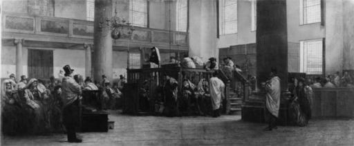 | Keywords: Jacob-Emile-Edouard Brandon - Portuguese Synagogue at Amsterdam - Walters 3733.jpg Brandon received a medal at the Paris Salon of 1867 the year this work was shown as Le Sermon du daian Cardozo; synagogue d'Amsterdam le 22 juillet 1866 It is a dramatically lighted interior view of one of Europe's most famous and picturesque synagogues consecrated 1675 The sermon is being delivered by the distinguished Talmudist David de Jahacob Lopez Cardozo 1808-1890 who was appointed ab bet din of the Portuguese Synagogue in 1839 Another painting of this interior La synagogue portugaise d'Amsterdam is cited by H Mireur Vente Brandon Paris 1897 Dictionaire des Ventes d'Art Paris 1911 1 440 1867 Oil on canvas cm 75 5 174 3 accession number 37 33 13459 William T Walters Baltimore prior to 1878 mode of acquisition unknown Henry Walters city Baltimore Walters Art Museum Henry Walters Acquired by William T Walters before 1878 Signature Lower right Ed Brandon; Date Lower right 1867 Salon Paris 1867 Musée du Louvre Paris 1867 place of origin France Walters Art Museum license 2D Paintings in the Walters Art Museum Interior of Portugees-Israëlietische Synagoge 1867 paintings Jacob-Emile-Edouard Brandon |