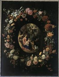 | Keywords: Jacob Foppen van Es, Hendrick van Balen - A garland of flowers and fruit with a central cartouche depicting the Holy Family.jpg Artwork Creator Jacob van Es and Creator Hendrick van Balen en A garland of flowers and fruit with a central cartouche depicting the Holy Family c 1620-1630 http //www photo rmn fr/archive/09-541002-2C6NU03ILQ3B html Oil canvas size cm 56 2 Institution Musée des Beaux-Arts d'Orléans object history credit line accession number PD-old-100 PD-old-100 Jacob Foppens van Es Hendrick van Balen Paintings in the musée des Beaux-Arts d'Orléans Still life paintings Baroque still life paintings of flowers Images from Réunion des musées nationaux |