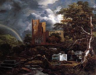 Keywords: jacob ruisdael painting art artistic artistry oil on canvas landscape sky clouds nature outside country countryside trees scenic building ruins cemetery night dusk evening rainbow graves