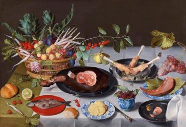 | Keywords: Jacob van Hulsdonck - A Still Life with Artichokes, Radishes, Asparagus, Plums, Cherries and Peaches in a Basket, together with a Ham and Pig’s Trotters.jpeg Artwork Creator Jacob van Hulsdonck en A Still Life with Artichokes Radishes Asparagus Plums Cherries and Peaches in a Basket together with a Ham and Pig ™s Trotters on pewter Plates a Herring a Tongue and some Butter on blue-and-white Dishes Mulberries in a blue-and-white Bowl a Knife Bread Grapes and a Lemon with a broken berkemeyer Glass all on a Table partly covered by a white Cloth 1608-1647 http //johnnyvanhaeften com/artists/jacob-van-hulsdonck-2 Oil panel size cm 71 5 104 object history credit line Signed lower left VAN HULSDONCK FE and monogrammed lower right on the plate IVH Sold at Johnny van Haeften Old Master Paintings accession number PD-old-100 PD-old-100 Jacob van Hulsdonck 17th-century still life paintings of fruits Oil still life paintings 1601-1650 paintings 17th-century oil on panel paintings |