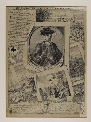 | Keywords: Jacobite broadside - Highlanders Medley on The Duke Triumphant.jpg Oval portrait of Duke of Cumberland in centre surrounded by 7 scenes of battle classical figures and a picture of a devil and a playing card as well as a piece of printed material entitled The Loyal Song Sung by Mr Beard at the Theatre Royal in Covent Garden about the rebellious Highlanders With two columns of verse at bottom of entire sheet and Published according to Act of Parliament 1746 Price d 6 Size cm 0 0 exhibition history Institution National Library of Scotland Prints and broadsides object history object type PD-old-70-1923 place of creation Blaikie SNPG 75240236 Jacobite broadside - Highlanders Medley on The Duke Triumphant Uploaded with GWToolset Jacobite broadside - Highlanders Medley on The Duke Triumphant http //deriv nls uk/56YK98Q/7524/75240238 2 jpg Images uploaded as part of NLS-WMUK collaboration Jacobite broadsides |