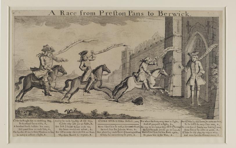 | Keywords: Jacobite broadside - Race from Prestonpans to Berwick.jpg Sir John Cope Brig Gen Fawkes Colonel Lascelles and Lord Mark Kerr Shows 3 men on horse back and one man standing at the gate-- all looking worried and hurried Text beneath Sr John Suck-Lynn a Ballad About Sir John running away from battle Size cm 0 0 exhibition history Institution National Library of Scotland Prints and broadsides object history object type PD-old-70-1923 place of creation Blaikie SNPG 75241589 Jacobite broadside - Race from Prestonpans to Berwick Uploaded with GWToolset Jacobite broadside - Race from Prestonpans to Berwick http //deriv nls uk/56YK98Q/7524/75241591 2 jpg Images uploaded as part of NLS-WMUK collaboration Jacobite broadsides |