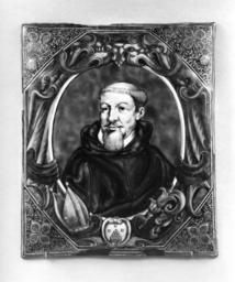| Keywords: Jacques Laudin I - Portrait of a Benedictine Abbot - Walters 44165.jpg The rectangular plaque shows the bust-length portrait three-quarters face to the left of a tonsured monk with small moustache and full chin-beard He wears the black habit of the Benedictine order The background is bright blue with a white line border The enamel framework is of octagonal shape the upper part suggesting the mask of a dragon its wings entwined with drapery; on the lower edge between the mitre and crozier of an abbot a coat-of-arms argent a mount of ten peaks in chief three billets or one and two In the spandrels gilt foliage with flowers in blue purple and green over paillettes of foil middle Other date century 17 technique painted enamel copper cm 20 3 16 8 accession number 44 165 33540 Henry Walters city Baltimore in New York Walters Art Museum Henry Walters Acquired by Henry Walters 1908 place of origin Limoges France Walters Art Museum license Limoges enamel - 17th century Renaissance portrait paintings in the Walters Art Museum Croziers in art Portrait miniatures in the Walters Art Museum Jacques Laudin I |