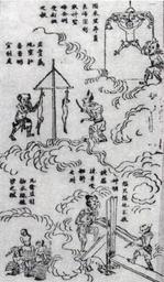 | Keywords: Jade Record 1.PNG Illustration from the 19th century Jade Record showing sinners being tortured in the sixth court of hell Hammering metal spikes into the body; skinning alive; sawing body in half; kneeling on metal filings Jonathan D Spence God's Chinese Son New York 1996 Page 40 Copied without permission from http //books google com PD-Art Drawings of China Chinese folk religion Diyu Flaying in art | ||||