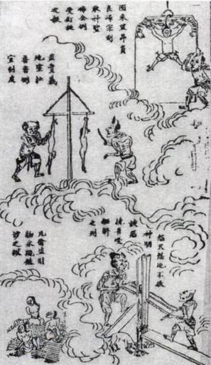 Keywords: Jade Record 1.PNG Illustration from the 19th century Jade Record showing sinners being tortured in the sixth court of hell Hammering metal spikes into the body; skinning alive; sawing body in half; kneeling on metal filings Jonathan D Spence God's Chinese Son New York 1996 Page 40 Copied without permission from http //books google com PD-Art Drawings of China Chinese folk religion Diyu Flaying in art |