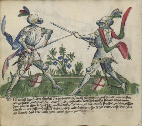 | Keywords: Jagiellonian Ms.Germ.Quart.16 (Gladiatoria) 09v - Longsword in armor.jpg Artwork en Longsword a leaf from the Gladiatoria fechtbuch Ms Germ Quart 16 folio 9v pl Półtorak karta z Gladiatoria fechtbuch Ms Germ Quart 16 folio 9v ink color parchment Kraków Institution Jagiellonian Library Caption Merckch das dritte stuckch / Ob er dich stechen wöll von vntten auf zu deinem visire des gesichtz vnd wolt dich dar Inn hertigleichen versuchen So schaw vnd nym dein swert chürtz vnd schaw eben auf yn wann er dir wolt stechen zu dem visire das du in treffest inderhalb des teners mit deinem stich So entwerst dw ym der handt das ers nicht wol mer genützin mag en Note the third technique If he wants to stab from below towards your visor and means to seek you here vigorously then look and take your sword close short And just when he means to thrust at your visor see that you hit him inside on his palm with your thrust thus you deprive him of his hand so that he cannot use it any more http //wiktenauer com/wiki/Gladiatoria_ MS_Germ Quart 16 Wiktenauer Ms Germ Quart 16 NR 5878 1989 ROK ca 1435 Unknown Germany Copyright expired PD-Art Other versions PD-old-70-1923 Ms Germ Quart 16 Swords of the 15th century Medieval knights Medieval miniatures of armour People with swords in art 1430s |