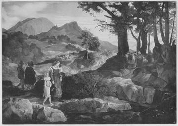 | Keywords: Jahrhundertausstellung 1906 KatNr. 0496.jpg Artwork Creator Carl Philipp Fohr Romantische Landschaft Oil Canvas cm 97 133 Großherzogl Schloß Darmstadt lt Quelle self scanned from own book Vorstand der Deutschen Jahrhundertausstellung Herausgeber žKatalog zur Ausstellung deutscher Kunst aus der Zeit von 1775 “1875 in der Königlichen Nationalgalerie Berlin Verlag F Bruckmann AG München 1906 2 Bände PD-old-70-1923 Other versions Carl Philipp Fohr Jahrhundertausstellung deutscher Kunst 1906 ImageNote 1 29 26 2507 1763 2565 1821 2 Vordergrund in tonreichem Braun das in den belichteten Teilen der Felsen nach grau spielt Das Mädchen in dunkelolivenem Kleid mit dunkelvioletten Ärmeln und zinnoberroter Schürze trägt ein weißgrau und dunkelblau gekleidetes Kind Das neben ihr gehende Kind in hellgrauem Hemd Hellbraunes Fleisch In den anderen Figuren dunkle graue braune rote und blaue Töne Die Berge des Mittelplans grau die des hellen Hintergrundes blau vor rosagelbem Himmel der nach oben in den Ton der blauen Berge übergeht und mit gelblich weißen Wolken bedeckt ist “ 1875 ImageNoteEnd 1 |