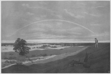 | Keywords: Jahrhundertausstellung 1906 KatNr. 0533.jpg Artwork Creator Caspar David Friedrich Landschaft auf Rügen mit Regenbogen Oil Canvas cm 59 87 Großherzogliches Museum Weimar lt Quelle self scanned from own book Vorstand der Deutschen Jahrhundertausstellung Herausgeber žKatalog zur Ausstellung deutscher Kunst aus der Zeit von 1775 “1875 in der Königlichen Nationalgalerie Berlin Verlag F Bruckmann AG München 1906 2 Bände um 1814 PD-old-70-1923 Other versions Caspar David Friedrich in Jahrhundertausstellung deutscher Kunst 1906 Jahrhundertausstellung deutscher Kunst 1906 ImageNote 1 22 13 2477 1658 2518 1683 2 Kombination von Grün und Blau Das Grün ist im Vordergrund fast durch den braunen Schatten verdeckt Im Mittelplan verschwindet es in der großen Schattensilhouette von bläulichem Grau und erhellt sich jenseits mit gelben Tönen Das Meer dunkelblau mit parallelen weißen Spritzern Im Himmel wird das Hellblau fast ganz von grauen in der Ferne weißen Wolken verdeckt Im Regenbogen überwiegt Blau neben Rosa und Gelb Der Mann im Vordergrund ist in helles Grau gekleidet mit roten blauen und hellbraunen Einzelheiten “ Um 1814 ImageNoteEnd 1 |