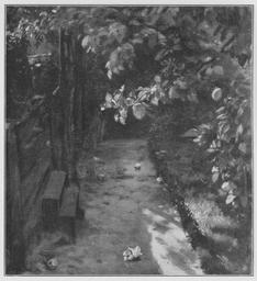 | Keywords: Jahrhundertausstellung 1906 KatNr. 0711.jpg Artwork Creator Ernst Henseler Gartenwinkel Oil Paperboard cm 39 33 Professor E Henseler Zehlendorf lt Quelle self scanned from own book Vorstand der Deutschen Jahrhundertausstellung Herausgeber žKatalog zur Ausstellung deutscher Kunst aus der Zeit von 1775 “1875 in der Königlichen Nationalgalerie Berlin Verlag F Bruckmann AG München 1906 2 Bände PD-old-70-1923 Other versions Ernst Henseler Jahrhundertausstellung deutscher Kunst 1906 ImageNote 1 20 18 1075 1178 1116 1223 2 Die Beleuchtung scheidet das reine helle Grün der Blätter von dem dunklen bläulichen Grün der beschatteten Teile Auf dem graurötlichen Weg helle fast weiße Sonnenflecke Hinter dem flüchtig angedeuteten olivegrünen Zaun eine rotbraune Fläche “ Bez unten links schwarz E Henseler ImageNoteEnd 1 |