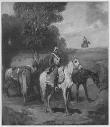 | Keywords: Jahrhundertausstellung 1906 KatNr. 1131.jpg Artwork Creator Hans von Marées Rastende Kürassiere Oil Canvas cm 48 43 Nationalgalerie Berlin lt Quelle Vorstand der Deutschen Jahrhundertausstellung Herausgeber žKatalog zur Ausstellung deutscher Kunst aus der Zeit von 1775 “1875 in der Königlichen Nationalgalerie Berlin Verlag F Bruckmann AG München 1906 2 Bände ; self scanned from own book um 1861 PD-old-70-1923 Other versions Paintings by Hans von Marées Jahrhundertausstellung deutscher Kunst 1906 Hans von Marées in Jahrhundertausstellung deutscher Kunst 1906 ImageNote 1 24 31 1773 2022 1818 2088 2 Der Kürassier in blaugrüner Uniform silbrigweißem Pallasch und Helm; gelblichweißes Pferd Das Blau kommt erhellt im Himmel wieder Die Wolken in reinem Weiß Das Pferd rechts rotbraun ebenso die beiden links Das zur äußersten Linken graue Beine rötlicher Rücken Derselbe rötliche Ton vorn am Boden Die Anhöhe ist mattgrün bewachsen Der Baum braun mit grünen Tupfen Der Reiter am Horizont grauweiß das Hinterteil des Pferdes rotbraun An einem abgeblätterten Stück des Pferdes sah man daß das ganze Bild tiefblau grundiert ist “ Um 1861 ImageNoteEnd 1 |