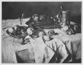 | Keywords: Jahrhundertausstellung 1906 KatNr. 1600.jpg Artwork Creator Carl Schuch Äpfel und Zinngeschirr Oil Canvas cm 69 88 Nationalgalerie Berlin lt Quelle Vorstand der Deutschen Jahrhundertausstellung Herausgeber žKatalog zur Ausstellung deutscher Kunst aus der Zeit von 1775 “1875 in der Königlichen Nationalgalerie Berlin Verlag F Bruckmann AG München 1906 2 Bände ; self scanned from own book PD-old-70-1923 Other versions Still life paintings by Carl Schuch Jahrhundertausstellung deutscher Kunst 1906 ImageNote 1 26 22 1447 1136 1498 1179 2 Grauweißes Tischtuch mit grauschwarzen Schatten Dieselbe Kombination konzentriert im Zinnkrug In den Zinntellern hat das Schwarz des Schattens das Grau auf ein Minimum in den Reflexen reduziert Die Äpfel tonreiches Rot mit weißen Reflexen abwechselnd mit zarten grünen gelben und braunen Tönen Hintergrund dunkelbraun “ Bez unten rechts weiß Schuch ImageNoteEnd 1 |