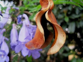 Keywords: jakaranda seedod split open brown spreading seed purple petals new life reproduce plant ecology earth life growth sprouting