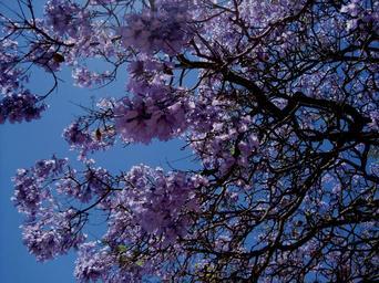 Keywords: jakaranda tree flower blooms petal trumpet shaped purple branches sky blue