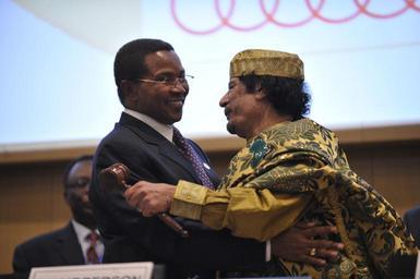 | Keywords: Jakaya Kikwete and Muammar al-Gaddafi, 12th AU Summit, 090202-N-0506A-678.jpg Jakaya Kikwete left the president of Tanzania embraces Muammar Qaddafi the Libyan chief of state in the Plenary Hall of the United Nations building in Addis Ababa Ethiopia during the 12th African Union Summit Feb 2 2009 The assembly elected Qaddafi to relieve Kikwete as chairperson of the African Union DefenseImagery mil http //defenseimagery mil/imagery html guid 5d8e13af5f43719e7835e4ec375c827782eaafdc VIRIN 090202-N-0506A-678 2009-02-02 U S Navy photo by Mass Communication Specialist 2nd Class Jesse B Awalt/Released PD-USGov-Military-Navy Jakaya Kikwete Muammar Gaddafi with national leaders African Union Africa Hall Addis Ababa Relations of Libya and Tanzania |