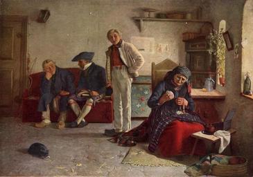 | Keywords: Jakob Kulle Hos kloka gumman.jpg Hos kloka gumman Oljemålning En klok gumma eller spåkvinna vill försöka att med tillhjälp av kort och kaffesump förutsäga en ung mans framtid; denne står bakom sibyllan under spänning väntande få höra sitt öde Tvenne gubbar äro även på besök hos den gamla och ha slagit sig ned på gummans soffa men tyckas ha något att förhandla sinsemellan Den ene av dem har över knäna brett ut en storblommig snusnäsduk på vilken ligger en halv limpa och som det tyckes ett bra stycke fett fläsk Att vara en anlitad klok gumma är rätt givande Gumman äger tydligen ett bra bohag och stugan saknar ej heller dyrbara textilier Och vad den stora blåmålade kistan inrymmer av dyrbarheter kan ingen veta Golvet är dock av det enklare slaget d v s av tillstampad lerjord - Gerda Cederblom http //libris kb se/bib/1471188 1875 Jakob Kulle 1838-1898 Paintings from Sweden by Jakob Kulle PD-old Uncategorized 2016 June 24 |