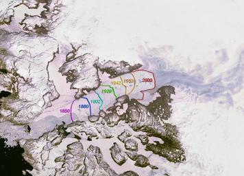 | Keywords: Jakobshavn Isbræ 1850-2003.jpg Retreat of the calving front of the Jakobshavn Isbræ 1850-2003 West Greenland from Nasa Earth Observatory http //www nasa gov/101952main_calvingstill_2001_2003 tiff PD-USGov Jakobshavn Isbræ Satellite pictures of Greenland Retreat of glaciers Retreat of glaciers in Greenland |