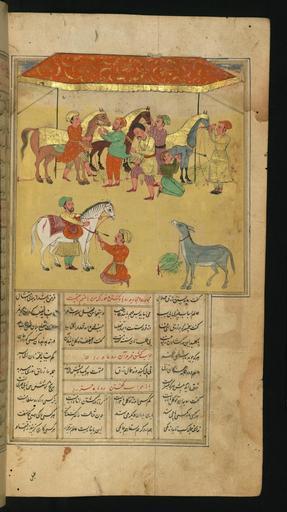 Keywords: Jalal al-Din Rumi, Maulana - Horses Return from Battle - Walters W626242B - Full Page.jpg On this folio from Walters manuscript W 626 badly wounded horses return from battle and make the donkey realize that it should be satisfied with its modest existence islamic 1663 1073 ink and pigments on thin laid paper probably Kashmiri cm 26 5 15 accession number W 626 242B 83770 Ibrahim date and mode of acquisition unknown round seal impression Ibrahim on front flyleaf iia Henry Walters Baltimore date and mode of acquisition unknown Walters Art Museum Henry Walters Acquired by Henry Walters place of origin Bharat Walters Art Museum license 2D Manuscript by Rumi Walters MS 626 Media contributed by the Walters Art Museum needs category review |