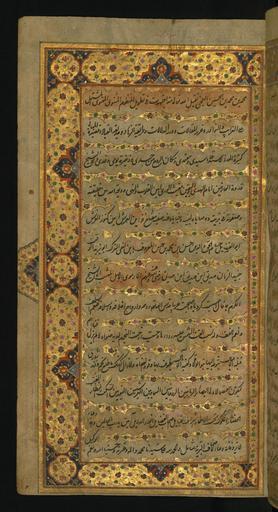 Keywords: Jalal al-Din Rumi, Maulana - Double-page Illuminated Incipit - Walters W6262A - Full Page.jpg This folio from Walters manuscript W 626 is the left side of a double-page illuminated incipit introducing the preface to the 1st book daftar of the Masnavi islamic 1663 1073 ink and pigments on thin laid paper probably Kashmiri cm 26 5 15 accession number W 626 2A 83723 Ibrahim date and mode of acquisition unknown round seal impression Ibrahim on front flyleaf iia Henry Walters Baltimore date and mode of acquisition unknown Walters Art Museum Henry Walters Acquired by Henry Walters place of origin Bharat Walters Art Museum license 2D Manuscript by Rumi Walters MS 626 Media contributed by the Walters Art Museum needs category review |