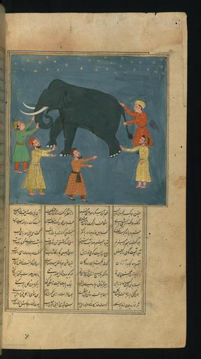 Keywords: Jalal al-Din Rumi, Maulana - Townspeople, Who have Never Seen an Elephant, Examine its Appearance in the Dark - Walters W626117B - Full Page.jpg On this folio from Walters manuscript W 626 townspeople who have never seen an elephant examine its appearance in the dark islamic 1663 1073 ink and pigments on thin laid paper probably Kashmiri cm 26 5 15 accession number W 626 117B 83750 Ibrahim date and mode of acquisition unknown round seal impression Ibrahim on front flyleaf iia Henry Walters Baltimore date and mode of acquisition unknown Walters Art Museum Henry Walters Acquired by Henry Walters place of origin Bharat Walters Art Museum license 2D Manuscript by Rumi Walters MS 626 Media contributed by the Walters Art Museum needs category review |