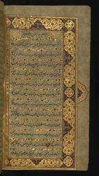 | Keywords: Jalal al-Din Rumi, Maulana - Double-page Illuminated Incipit - Walters W6261B - Full Page.jpg This folio from Walters manuscript W 626 is the right side of a double-page illuminated incipit introducing the preface to the 1st book daftar of the Masnavi islamic 1663 1073 ink and pigments on thin laid paper probably Kashmiri cm 26 5 15 accession number W 626 1B 83722 Ibrahim date and mode of acquisition unknown round seal impression Ibrahim on front flyleaf iia Henry Walters Baltimore date and mode of acquisition unknown Walters Art Museum Henry Walters Acquired by Henry Walters place of origin Bharat Walters Art Museum license 2D Manuscript by Rumi Walters MS 626 Media contributed by the Walters Art Museum needs category review |