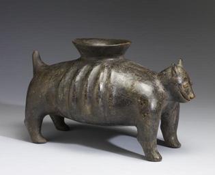 | Keywords: Jalisco - Dog Effigy Vessel - Walters 20092023 - Three Quarter Right.jpg Dogs were indigenous to the ancient Americas the Mexican Hairless being the likely model for the West Mexico effigies Throughout Mesoamerica they served as companions hunting partners underworld guides and even sources of food Ceramic portrayals of dogs are particularly numerous in the shaft tombs of West Mexico placed among the burials' myriad human pottery figures and dishes of food for the journey after death Most dogs are depicted as plump and docile As tomb offerings these fattened versions may have symbolized food for the deceased's arduous underworld voyage The black-slipped canine deftly combines a jar form the most important vessel in the Mesoamerican household with an appealing rendering of a smiling dog In this example the dog's ribs recall the flutes of a gourd the ageless and most common food-service vessel throughout the ancient Americas Considered as a whole this vessel-sculpture's multiple references to food suggest that it too alludes to dogs as sustenance 300 BC-AD 200 Archaic burnished earthenware H 8 3/16 x L 13 15/16 x W 7 1/2 in 20 8 x 35 4 x 19 cm accession number 2009 20 23 80178 Ron Messick Fine Arts Santa Fe New Mexico date and mode of acquisition unknown John G Bourne 1990s by purchase Walters Art Museum Gift of John Bourne 2009 place of origin Jalisco Mexico Walters Art Museum license Pottery from ancient Jalisco in the Walters Art Museum Art of Mexico Media contributed by the Walters Art Museum needs category review Dogs in Pre-Columbian art |