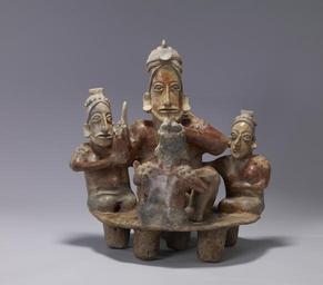 | Keywords: Jalisco - Feasting Scene - Walters 482768.jpg The Feasting Scene constitutes a unique sculptural ceramic of exceptional quality produced by the Jalisco ceramicists of ancient West Mexico Four female figures kneeling around a male figure comprise the sculptural assemblage The figures are arranged on a circular bench supported by six cylindrical legs The central figure an imposing chief or cacique holds a tube or pestle in his left hand and an hacha or ceremonial axe in his upraised right hand One female figure directly facing the cacique holds a small shallow bowl in her right hand and a baton in her left hand Two of the female figures rest a hand on the cacique a gesture indicating relatedness A third figure to the cacique's right rests one hand on the chief's shoulder and the other on his elbow The assemblage has been painted with a red and cream clay slip; details on each of the figures are rendered in resist-paint Conventional to the Jalisco figural style are elongated faces full rounded legs and torsos erect posture and vacant staring eyes The figures represent elite persons of West Mexico society as indicated by their ornate crested helmets shoulder scarification body and facial tattoos and ear disks Their position on a raised bench mirrors the context of circular elevated platforms characteristic of Jalisco ceremonial architecture These platforms were also painted red and white Shaft-and-chamber tombs of high-ranking families have been found below the circular structures A sculptural ceramic such as this would have been placed in mausolea of this type This sculptural assemblage likely represents an elite family feasting ritual or commemorates an ancestral tradition Such rituals involved consumption of fermented beverages by a select few Sculptures depicting group rituals are extremely rare among the corpus of West Mexico ceramics The Feasting Scene therefore represents a remarkable exception to Jalisco visual art conventions 300 BC-AD 300 Protoclassic earthenware red-slipped resist painting appliqué cm 51 4 50 2 43 2 accession number 48 2768 6954 Karl Pope Taxco Mexico 1970 Dr and Mrs George Alderman Baltimore date and mode of acquisition unknown Walters Art Museum Gift of George and Julianne Alderman 2003 place of origin Jalisco Mexico Walters Art Museum license Pottery from ancient Jalisco in the Walters Art Museum Art of Mexico Media contributed by the Walters Art Museum needs category review Scarification in art Body piercing in art |