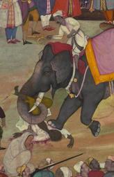 Keywords: Jamal al-Din Husayn Inju Shirazi - Two Folios from the Akbarnama - Walters W684 - Detail A.jpg These two Mughal paintings Walters manuscript W 684 are originally from a copy of the Akbarnamah the official history of the reign of the Mughal Emperor Akbar reigned 964-1015 AH/AD 1556-1605 written by Abu al-Fazl ibn Mubarak died 1011 AH/AD 1602 The manuscript from which the two paintings derive is divided largely between the British Library Or MS 2988 and the Chester Beatty Library Ms 3 This illustrated historical manuscript has been dated between the late 10th century AH/AD 16th to the initial years of the 11th century AH/AD 17th The two Walters paintings are pasted over the central text panel of a page from Farhang-i Jahangiri an imperial Persian language dictionary by Jamal al-Din Husayn Inju Shirazi died 1035 AH/AD 1625-1626 This was done in the early 20th century by the French dealer Demotte late 10th century AH/AD 16th century Mughal ink pigments paper Folio cm 34 5 22 5 ; Image cm 23 5 13 2 accession number W 684 30104 Demotte date and mode of acquisition unknown Henry Walters Baltimore date and mode of acquisition unknown Walters Art Museum Henry Walters Acquired by Henry Walters Elephants The Walters Art Gallery Baltimore 1987-1988 place of origin India Walters Art Museum license 2D Media contributed by the Walters Art Museum needs category review Media contributed by the Walters Art Museum needs artist review Mughal miniatures in the Walters Art Museum Elephant riding in art of India Execution by elephant Akbarnamah by Abu'l-Fazl ibn Mubarak Walters MS 874 Miniatures of elephants