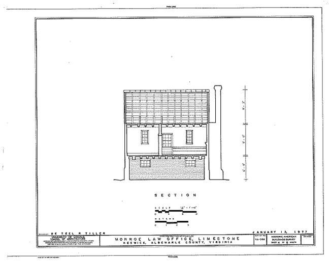 Keywords: James Monroe Law office 4a.gif en TITLE Monroe Law Office Limestone Plantation Virginia Route 250 Keswick Albemarle County VA CALL NUMBER HABS VA 2-KESW 1A- REPRODUCTION NUMBER See Call Number MEDIUM Measured Drawing s 8 18 x 24 in Data Page s 10 plus cover page DATE Documentation compiled after 1933 CREATOR Historic American Buildings Survey creator RELATED NAME S Monroe James Jefferson Thomas NOTE Survey number HABS VA-988 Unprocessed field note material exists for this structure FN-280 Building/structure dates 1794 initial construction Significance The Limestone Estate is part of the original Crawford and Lewis patents of 1731 and 1734 Subsequent owners include James Monroe his brother Andrew Thomas Jefferson and Dr George Blaetterman in whose family the property remained until the twentieth century The Monroe Law Office - the oldest residential structure - bears the date 1794 and is known to have been used by both James and Andrew Monroe The Monroe Law Office is a small three bay single pile eighteenth century wood frame structure raised on a high brick basement with a steeply pitched roof Although only one of the two original external ramped chimneys remain and numerous alterations have taken place the Monroe Law Office remains an exemplary eighteenth century Tidewater form transplanted to Piedmont Virginia SUBJECTS VIRGINIA--Albemarle County--Keswick COLLECTION Historic American Buildings Survey Library of Congress REPOSITORY Library of Congress Prints and Photograph Division Washington D C 20540 USA DIGID http //hdl loc gov/loc pnp/hhh va0069 CONTROL VA0069 LOC-image hhh va0069 Historic American Buildings Survey 1933 VA 2-KESW 1A- Higher resolution JPEG uncompressed archival TIFF James Monroe Law office |