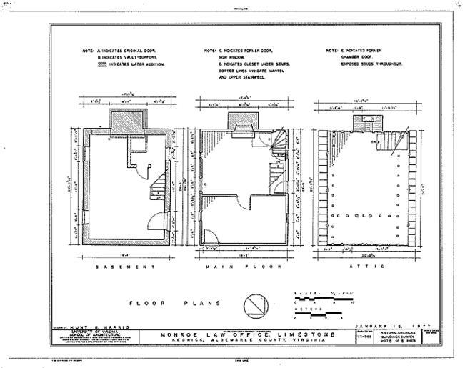 Keywords: James Monroe Law office 5a.gif en TITLE Monroe Law Office Limestone Plantation Virginia Route 250 Keswick Albemarle County VA CALL NUMBER HABS VA 2-KESW 1A- REPRODUCTION NUMBER See Call Number MEDIUM Measured Drawing s 8 18 x 24 in Data Page s 10 plus cover page DATE Documentation compiled after 1933 CREATOR Historic American Buildings Survey creator RELATED NAME S Monroe James Jefferson Thomas NOTE Survey number HABS VA-988 Unprocessed field note material exists for this structure FN-280 Building/structure dates 1794 initial construction Significance The Limestone Estate is part of the original Crawford and Lewis patents of 1731 and 1734 Subsequent owners include James Monroe his brother Andrew Thomas Jefferson and Dr George Blaetterman in whose family the property remained until the twentieth century The Monroe Law Office - the oldest residential structure - bears the date 1794 and is known to have been used by both James and Andrew Monroe The Monroe Law Office is a small three bay single pile eighteenth century wood frame structure raised on a high brick basement with a steeply pitched roof Although only one of the two original external ramped chimneys remain and numerous alterations have taken place the Monroe Law Office remains an exemplary eighteenth century Tidewater form transplanted to Piedmont Virginia SUBJECTS VIRGINIA--Albemarle County--Keswick COLLECTION Historic American Buildings Survey Library of Congress REPOSITORY Library of Congress Prints and Photograph Division Washington D C 20540 USA DIGID http //hdl loc gov/loc pnp/hhh va0069 CONTROL VA0069 LOC-image hhh va0069 Historic American Buildings Survey 1933 Higher resolution JPEG uncompressed archival TIFF VA 2-KESW 1A- James Monroe Law office |