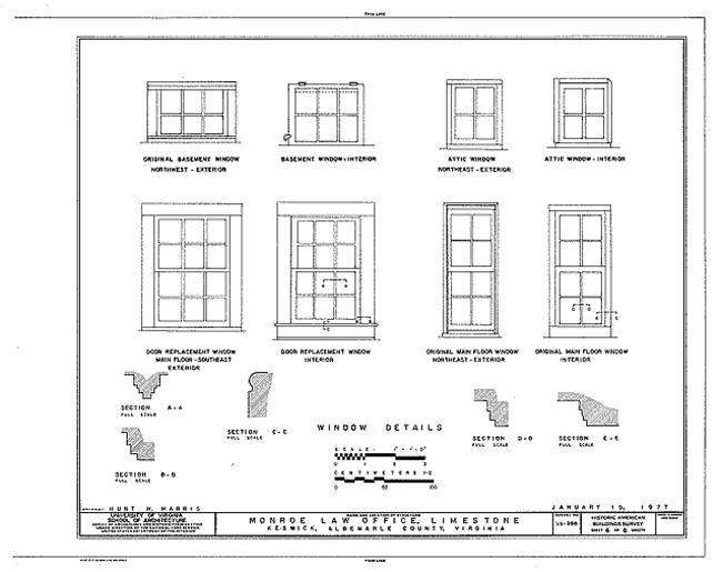 Keywords: James Monroe Law office 6a.gif en TITLE Monroe Law Office Limestone Plantation Virginia Route 250 Keswick Albemarle County VA CALL NUMBER HABS VA 2-KESW 1A- REPRODUCTION NUMBER See Call Number MEDIUM Measured Drawing s 8 18 x 24 in Data Page s 10 plus cover page DATE Documentation compiled after 1933 CREATOR Historic American Buildings Survey creator RELATED NAME S Monroe James Jefferson Thomas NOTE Survey number HABS VA-988 Unprocessed field note material exists for this structure FN-280 Building/structure dates 1794 initial construction Significance The Limestone Estate is part of the original Crawford and Lewis patents of 1731 and 1734 Subsequent owners include James Monroe his brother Andrew Thomas Jefferson and Dr George Blaetterman in whose family the property remained until the twentieth century The Monroe Law Office - the oldest residential structure - bears the date 1794 and is known to have been used by both James and Andrew Monroe The Monroe Law Office is a small three bay single pile eighteenth century wood frame structure raised on a high brick basement with a steeply pitched roof Although only one of the two original external ramped chimneys remain and numerous alterations have taken place the Monroe Law Office remains an exemplary eighteenth century Tidewater form transplanted to Piedmont Virginia SUBJECTS VIRGINIA--Albemarle County--Keswick COLLECTION Historic American Buildings Survey Library of Congress REPOSITORY Library of Congress Prints and Photograph Division Washington D C 20540 USA DIGID http //hdl loc gov/loc pnp/hhh va0069 CONTROL VA0069 LOC-image hhh va0069 Historic American Buildings Survey 1933 VA 2-KESW 1A- Higher resolution JPEG uncompressed archival TIFF James Monroe Law office Windows in Virginia |