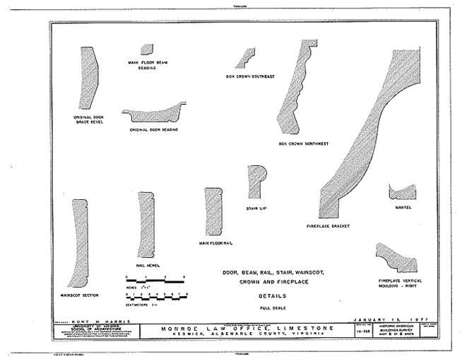 | Keywords: James Monroe Law office 8a.gif en TITLE Monroe Law Office Limestone Plantation Virginia Route 250 Keswick Albemarle County VA CALL NUMBER HABS VA 2-KESW 1A- REPRODUCTION NUMBER See Call Number MEDIUM Measured Drawing s 8 18 x 24 in Data Page s 10 plus cover page DATE Documentation compiled after 1933 CREATOR Historic American Buildings Survey creator RELATED NAME S Monroe James Jefferson Thomas NOTE Survey number HABS VA-988 Unprocessed field note material exists for this structure FN-280 Building/structure dates 1794 initial construction Significance The Limestone Estate is part of the original Crawford and Lewis patents of 1731 and 1734 Subsequent owners include James Monroe his brother Andrew Thomas Jefferson and Dr George Blaetterman in whose family the property remained until the twentieth century The Monroe Law Office - the oldest residential structure - bears the date 1794 and is known to have been used by both James and Andrew Monroe The Monroe Law Office is a small three bay single pile eighteenth century wood frame structure raised on a high brick basement with a steeply pitched roof Although only one of the two original external ramped chimneys remain and numerous alterations have taken place the Monroe Law Office remains an exemplary eighteenth century Tidewater form transplanted to Piedmont Virginia SUBJECTS VIRGINIA--Albemarle County--Keswick COLLECTION Historic American Buildings Survey Library of Congress REPOSITORY Library of Congress Prints and Photograph Division Washington D C 20540 USA DIGID http //hdl loc gov/loc pnp/hhh va0069 CONTROL VA0069 LOC-image hhh va0069 Historic American Buildings Survey 1933 VA 2-KESW 1A- Higher resolution JPEG uncompressed archival TIFF James Monroe Law office |