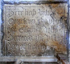 | Keywords: JamesCourtenay Died1592 CheritonFitzpaineChurch Devon.PNG en The ledger stone across the middle of which now stands the 1926 wooden chancel screen of James Courtenay d 1592 The Younger of Upcott Barton in the Upcott Chapel St Matthew's Church Cheriton Fitzpaine Devon the most ancient stone in the church Burchmore Geoff Ed St Matthew's Cheriton Fitzpaine Guide and Information 2014 p 2 church booklet inscribed in Gothic script as follows </br> Here lieth James Courteny The Younger Estquier who deceased the viii day of September A nn o D o m 1592 </br> own photo Lobsterthermidor <span class signature-talk ></span> 20 10 14 October 2015 UTC 2015 Cheriton Fitzpaine |