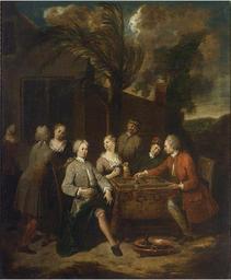 | Keywords: Jan Baptist Lambrechts - Servants around a table with vegetables in a garden setting.jpg Artwork Creator Jan Baptist Lambrechts 1700-1731 Oil on canvas cm 57 47 5 At Sotheby's 15 November 2015 Amsterdam lot 119<br>A pair with An elegant company conversing and playing tric-trac in a garden setting accession number place of creation http //www sothebys com/en/auctions/ecatalogue/2005/old-master-paintings-am0973/lot 119 html PD-old-100 other versions PD-old-100 Jan Baptist Lambrechts Merry companies in Flemish genre paintings |