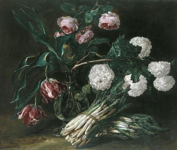 | Keywords: Jan Fyt - Vase of Flowers and two Bunch of Asparagus.jpg Artwork Creator Jan Fyt 1650 Oil on canvas size cm 63 7 75 4 Institution Museo Thyssen-Bornemisza object history credit line accession number http //www museothyssen org/en/thyssen/zoom_obra/1091 PD-old-100 Still life paintings by Joannes Fijt Southern Netherlandish paintings in the Thyssen-Bornemisza Museum | ||||