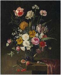 | Keywords: Jan Philip van Thielen - Roses, tulips, carnations and an iris in a glass vase on a draped stone ledge.jpg Artwork Creator Jan Philips van Thielen title Roses tulips carnations and an iris in a glass vase on a draped stone ledge 17th century http //www christies com/LotFinder/lot_details aspx intObjectID 5022060 oil canvas cm 73 59 Sold at Christie's on 7 December 2007 in London lot 128 The fruit on the ledge may have been executed by a different hand within the 17th century PD-old-100 indistinctly signed 'I P ' lower centre on the ledge Other versions Jan Philip van Thielen Bouquets in art 17th-century oil on canvas paintings 17th-century still life paintings of flowers in glass vases |