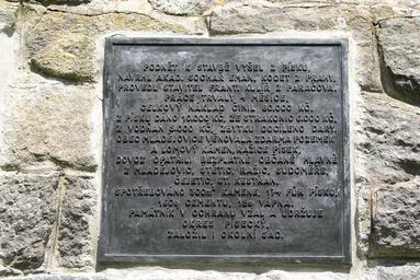 | Keywords: Jan Žižka memorial 07.JPG en Žižka memorial at the Battle of Sudoměř area near Sudoměř village Strakonice district Czech Republic cs Památník Jana Žižky v areálu bitvy u Sudoměře okres Strakonice Text na bronzové desce Podnět k stavbě vyšel z Písku navrhl akad sochař Eman Kodet z Prahy provedl stavitel Frant Kulíř z Paračova Práce trvaly měsíce celkový náklad činil 80 000 Kč Z Písku dáno 10 000 Kč ze Strakonic 6 000 Kč z Vodňan 5 000 Kč zbytku docíleno dary Obec MLadějovice věnovala zdarma pozemek a lomový kámen Ražice písek dovoz opatřili bezplatně občané hlavně z Mladějovic Štětic Ražic Sudoměře Čejetic St Kestřan Spotřebováno 300 m3 kamene 174 fůr písku 160 q cementu 15 q vápna Památník v ochranu vzal a udržuje okres písecký založil i okolní sad own 2012-06-29 11 10 00 Feťour Žižka memorial Sudoměř |