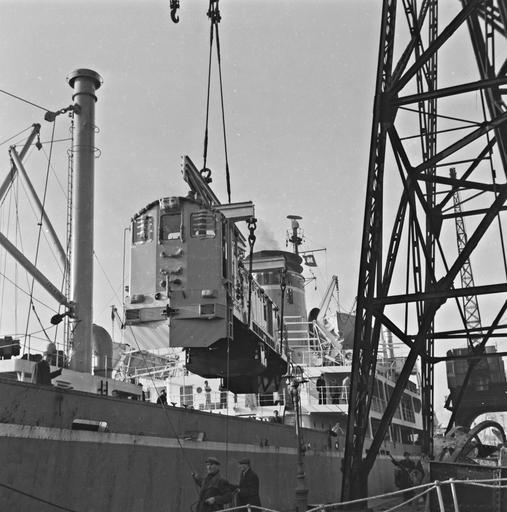 Keywords: general motors generalmotors gm diesel locomotive b124 ship north wall northwall dublin ireland leinster cranes dockers coras iompair éireann corasiompairéireann c.i.é cié trains railways railroads january 1961 1960s sixties james p. o'dea jamespodea 8-567cr 8567cr single cab bo-bo singlecabbobo national library of ireland nationallibraryofireland o'dea photographic collection odeaphotographiccollection blackandwhite monochrome outdoor black and white This is General Motors or GM diesel locomotive B124 being unloaded from a ship at the North Wall in Dublin following its arrival on a ship from America. Thanks to Seuss. for this link to tons of information about B124 on the Irish Traction's Group website... Date: 4 January 1961 NLI Ref.: ODEA 23/8 This is General Motors or GM diesel locomotive B124 being unloaded from a ship at the North Wall in Dublin following its arrival on a ship from America. Thanks to Seuss. for this link to tons of information about B124 on the Irish Traction's Group website... Date: 4 January 1961 NLI Ref.: ODEA 23/8 |