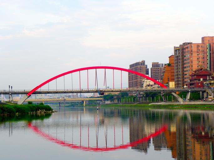 Keywords: japan bridge architecture reflections river summer spring trees outside red buildings shoreline beautiful