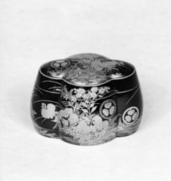 | Keywords: Japanese - Box for Incense Ash - Walters 6740.jpg This takigara-ire is four-lobed and decorated in black and gold lacquer The lid and exterior sides of the box are decorated with similar designs of autumnal flowers small rocks and four mitsuaoi crests There is a black ro-iro background for a design in hira-makie in gold; the interior of the lid and the exterior bottom of the box are decorated with nashiji; the interior of the box is covered with gilded metal The rims are kinji century 19 Edo-Meiji black and gold lacquer gilded metal cm 4 7 4 7 6 6 accession number 67 40 10213 Henry Walters Baltimore date and mode of acquistion unknown Walters Art Museum Henry Walters Acquired by Henry Walters place of origin Japan Walters Art Museum license Art of Japan in the Walters Art Museum Media contributed by the Walters Art Museum needs category review Maki-e Kōgō |