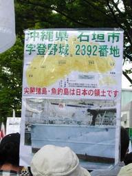 | Keywords: Japanese conservative holds a placard on anti-Chinese government 02.jpg en Anti-Chinese government placard bearing the words 2392 Tonoshiro Ishigaki City Okinawa Prefecture Uotsuri Jima in Senkaku Islands is Japanese territory ja 10 2中国の尖閣諸島侵略糾弾!全国国民統 行動で使われたプラカード 沖縄 石垣市字登野城2392番 尖閣諸島魚釣島は日 の領 です own 守 2010-10-02 Protest against the Government of China in Japan 2 October 2010 | ||||