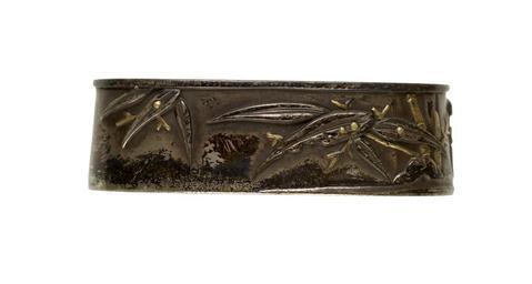 | Keywords: Japanese - Fuchi with Bamboo and Plums - Walters 5112433A.jpg The fuchi is decorated with bamboo on the front and plum blossoms on the reverse It may have originally been paired with a kashira depicting pine trees because those three plants are known as the three friends of winter This is part of a mounted set early-mid 19th century Edo shibuichi gold cm 3 9 2 1 1 2 accession number 51 1243 3A 79624 Henry Walters Baltimore date and mode of acquistion unknown Walters Art Museum Henry Walters Acquired by Henry Walters Mark Assembly mark in ink inside fuchi i jyô tsu ki place of origin Japan Walters Art Museum license Fuchi in the Walters Art Museum White background Media contributed by the Walters Art Museum needs category review |